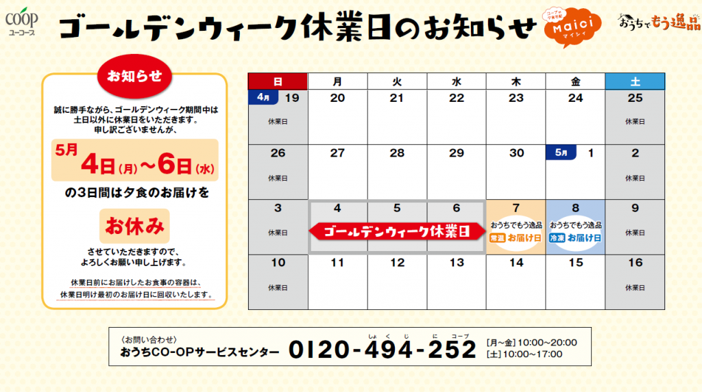 5月4日(月)~5月6日(水)は夕食のお届けをお休みさせていただきます。